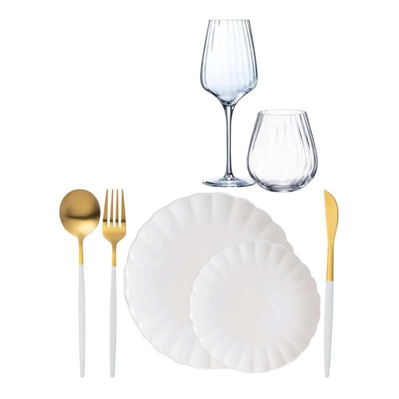 La gamme Akiko apporte une touche d’originalité et d’élégance à vos tables grâce à son design raffiné. L’assiette aux délicats reliefs, les couverts bicolores or et blanc, ainsi que la verrerie texturée créent une atmosphère chic et contemporaine.