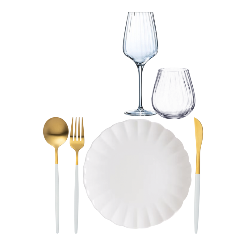 La gamme Akiko apporte une touche d’originalité et d’élégance à vos tables grâce à son design raffiné. L’assiette aux délicats reliefs, les couverts bicolores or et blanc, ainsi que la verrerie texturée créent une atmosphère chic et contemporaine.