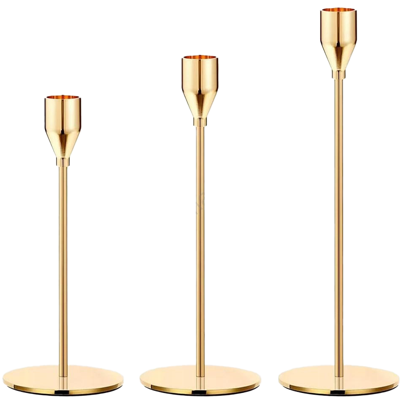 Apportez une touche d’élégance contemporaine à vos tables grâce à ce lot de trois bougeoirs en métal doré aux lignes épurées. Leur silhouette conique minimaliste et leurs hauteurs dégradées créent un jeu de volumes raffiné, idéal pour des mises en scène graphiques et chaleureuses.